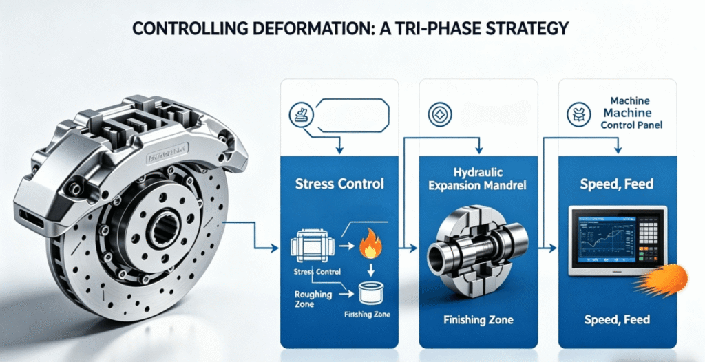 Thin-walled aluminum brake parts are highly susceptible to distortion during the CNC turning brake process due to internal stresses and cutting forces. Top-tier CNC turning process suppliers implement a “Triple-Control” strategy to meet the exacting standards of precision CNC machining automotive components.